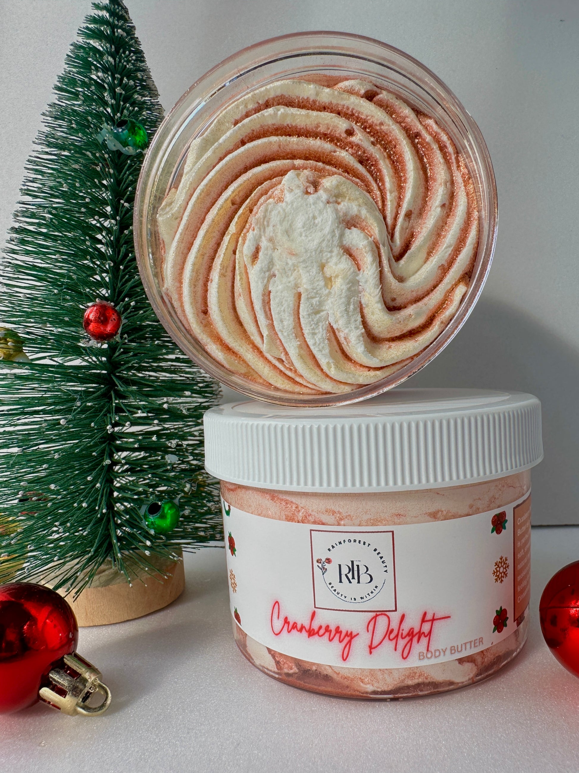 Introducing our Cranberry Delight Body Butter! This luxurious and velvety blend will melt into your skin, leaving you feeling like a winter wonderland princess! The perfect holiday accessory, you'll have strangers stopping you in the street with "What is that heavenly scent?!" But it's not just about the fragrance - this butter will make you look and feel like a million bucks!