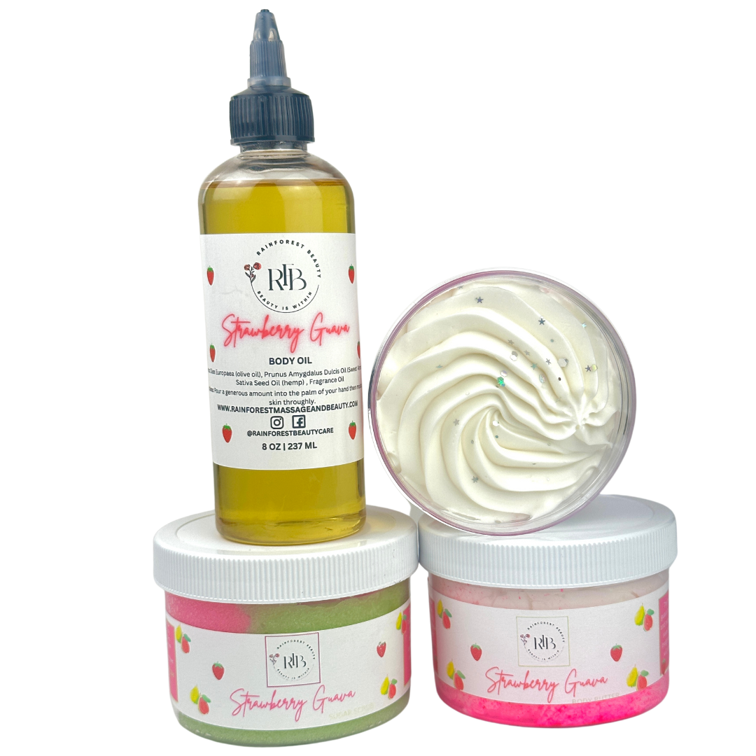 Immerse yourself in the tropical allure of our Strawberry Guava Spa Set. This luxurious oil is crafted to provide your skin with deep hydration and a radiant glow, all while enveloping you in a deliciously fruity fragrance that's perfect for the summer season. Get ready to turn heads wherever you go with this irresistible Spa Set