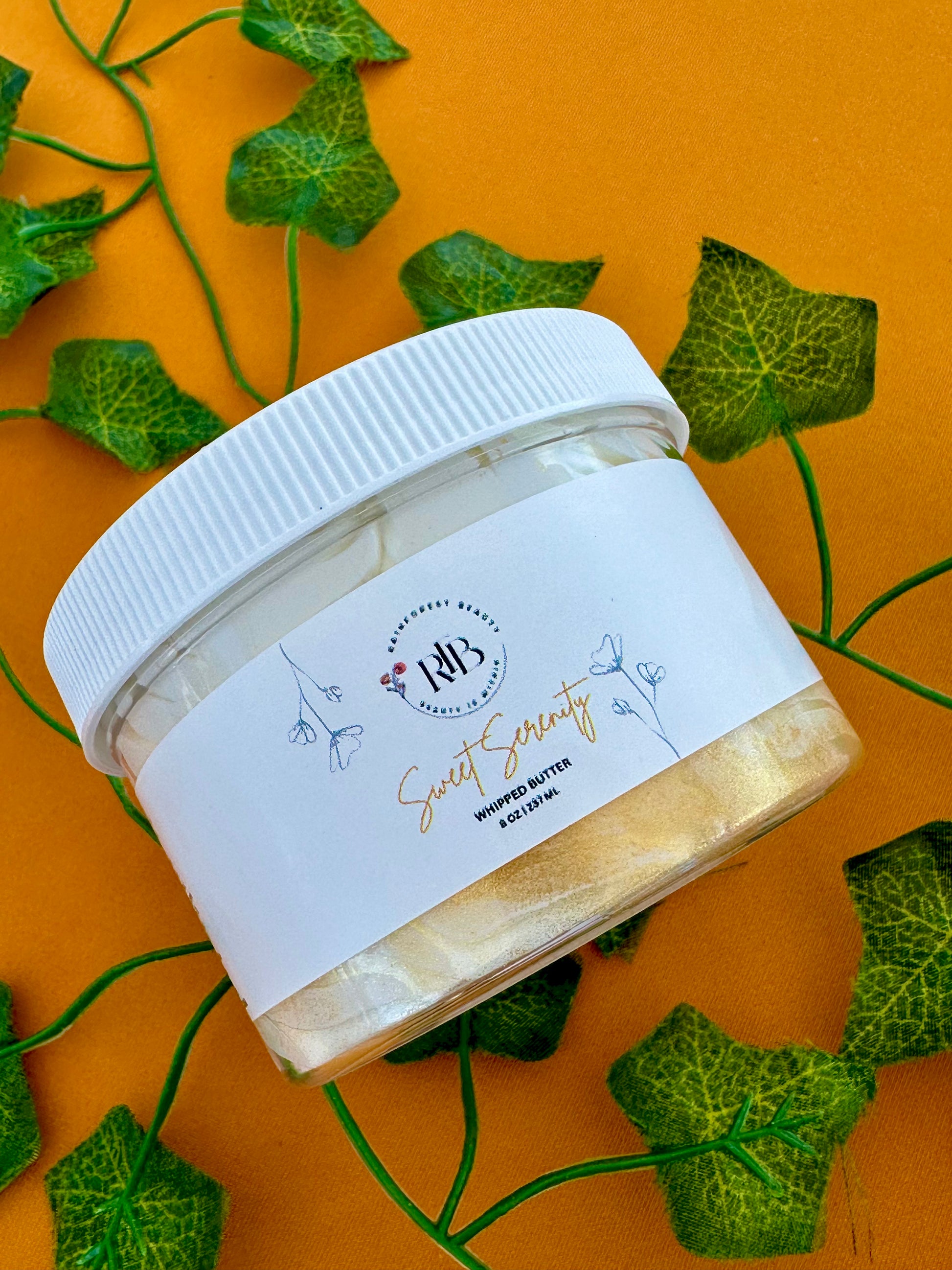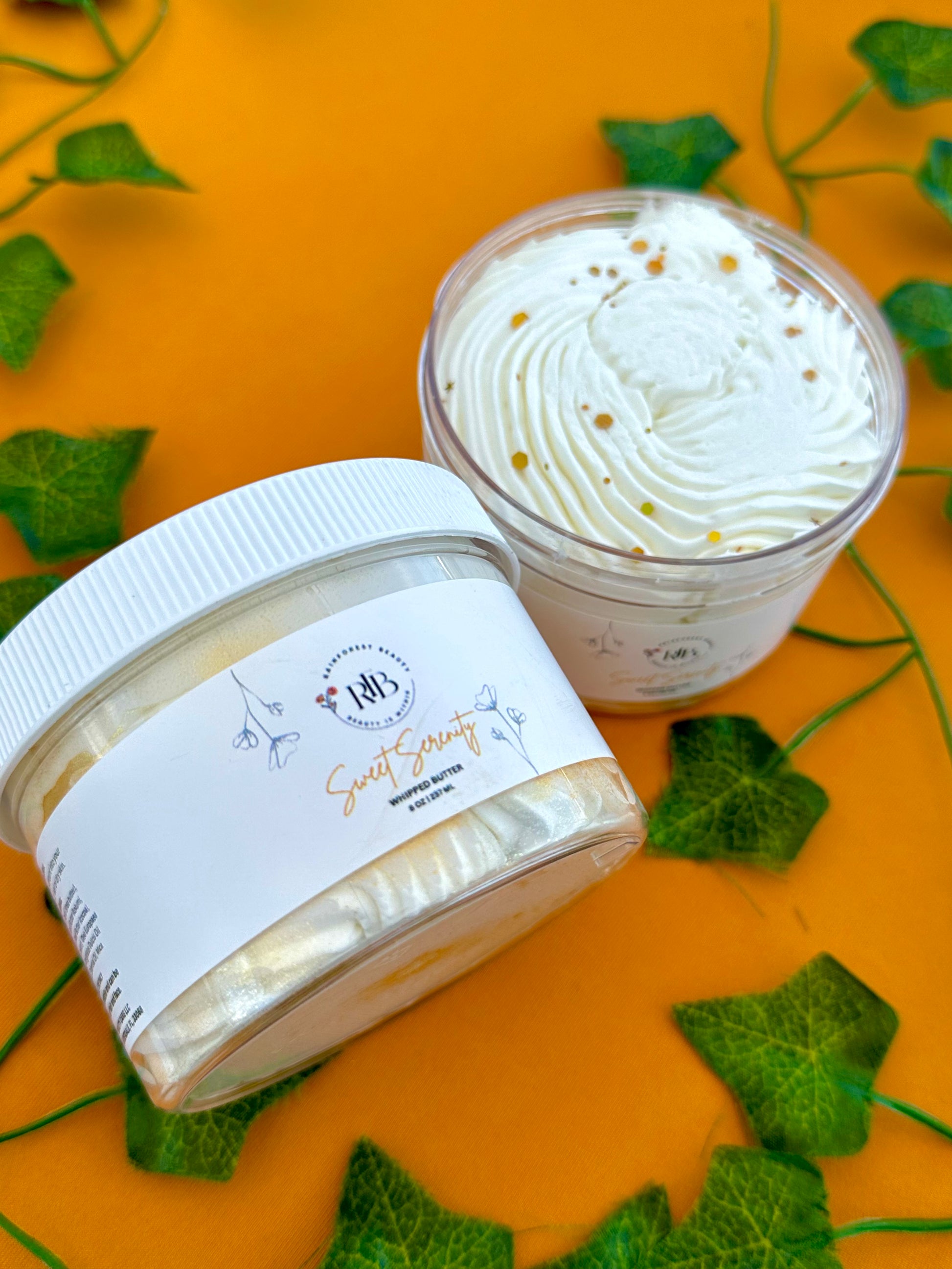 Our Sweet Serenity Body Butter is sweetly scented with Jasmine and Honeysuckle. A wonderful combination of sweet honey dancing with the floral aroma of Jasmine flower. This scent is light, sweet, and fluffy with top notes of lemon and ginger. As you fall deep into our sultry aroma, hints of violet, powder, andamyris mingle with wood notes to catch you as you fall.. into Sweet Serenity.