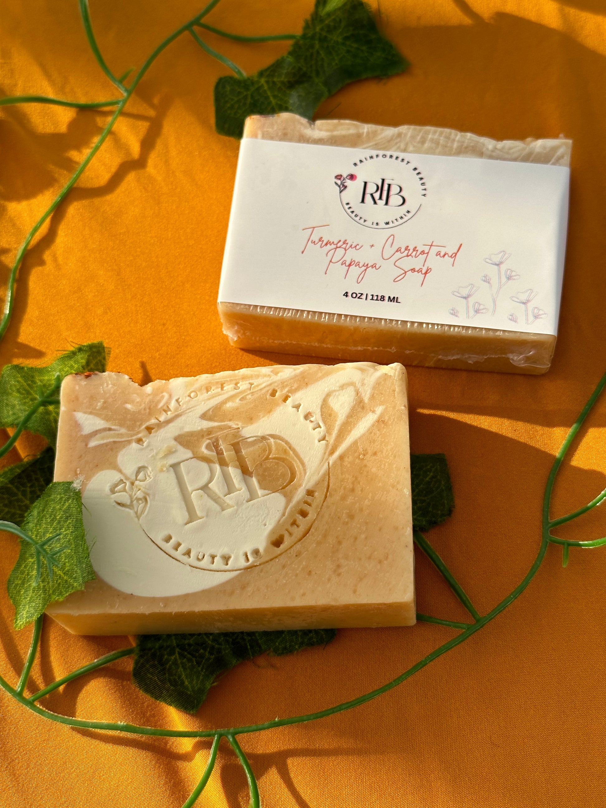 Turmeric Carrot + Papaya Soap harnesses the natural properties of turmeric, carrot puree, papaya puree, and lemongrass to impart a radiant and youthful glow to the skin. The soap contains beneficial antioxidants and skin-brightening oils that create an irresistibly pudgy aroma. Its unique combination of ingredients results in a skin brightening effect, perfect for restoring a healthy, glowing complexion.