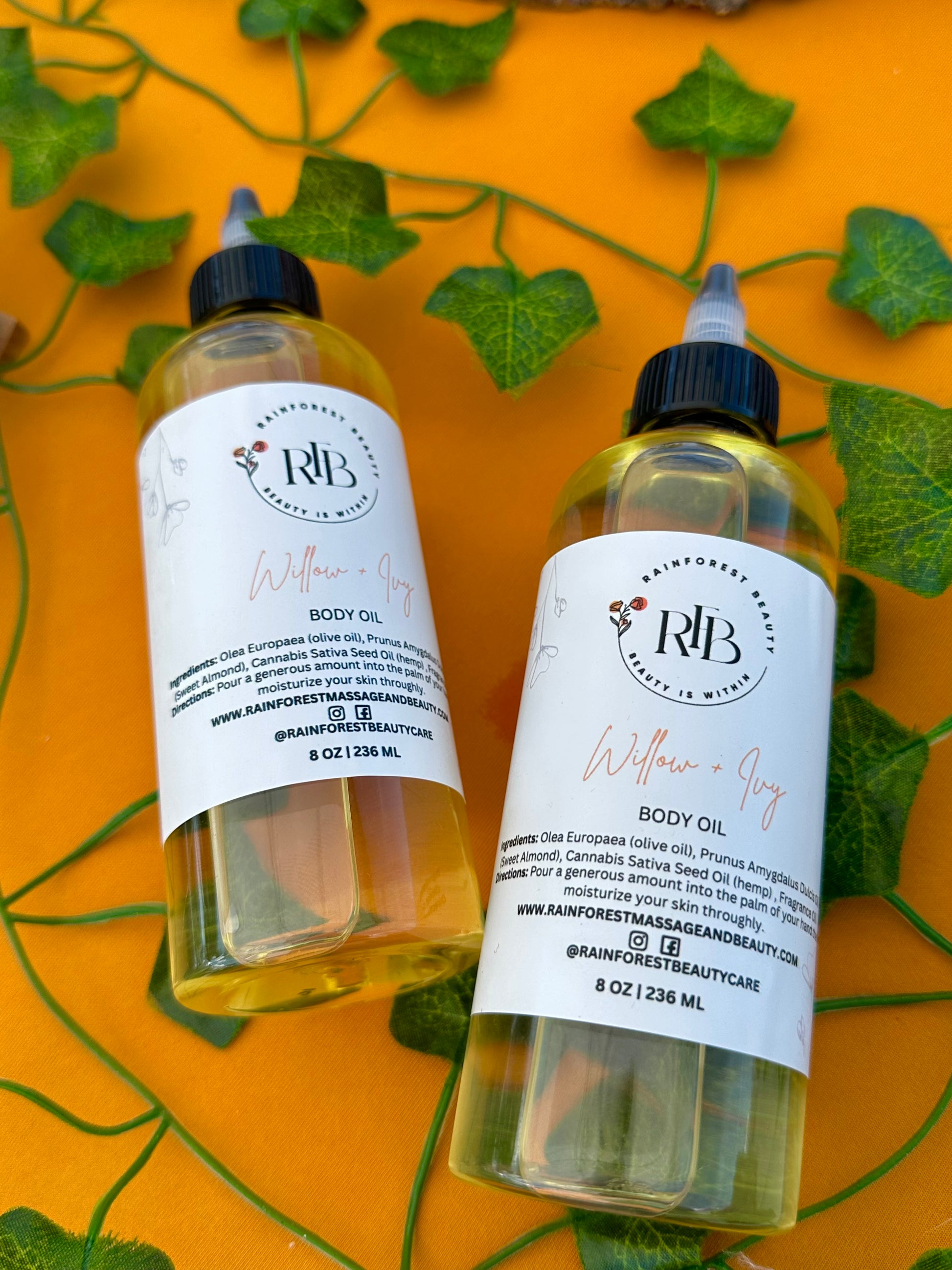 Willow + Ivy Body Oil is a luxurious, light body oil with a natural and clean earthy scent. It blends scents of sparkling cassis, pink grapefruit, bergamot, ivy, and lily of the valley for a soothing and calming experience. Top it off with hints of willow, violet, and musk for a specially designed aroma that can be further enhanced with your favorite perfume. This high-quality oil will keep your skin moisturized and hydrated, making it an essential part of your skincare routine.